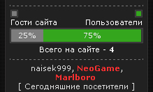 ![]() ![]() Выводит статистику в процентах, соотношением "Гостей" и "Пользователей" Онлайн. Плюс показывает общее кол-во онлайн в данный момент, не использует информер. Просто в использовании , легко изменяем под дизайн и др. [ ] » Интересные часы для сайтов ucoz[ ] » Flash игра для сайта Аэрохокей с Микки[ ] » Флеш игра Крабы и волейбол |
